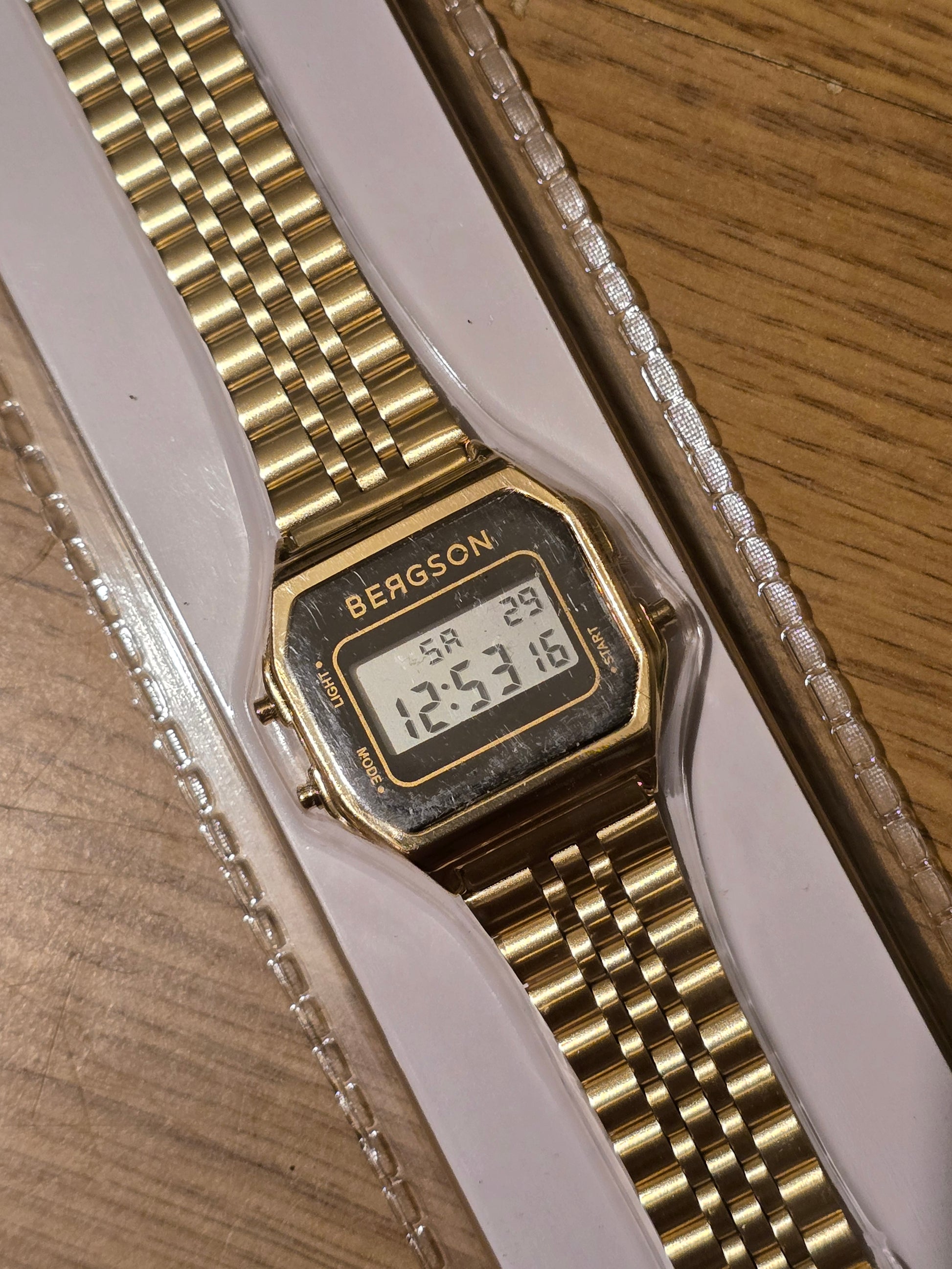 Step back in time with the Bergson Unisex Digital Watch - Gold. Featuring a classic design and elegant looks, this watch exudes a retro style that is sure to turn heads. The durable stainless steel strap and reliable Quartz Movement make this watch a timeless accessory. Add a touch of nostalgia to your wardrobe with this new timepiece.