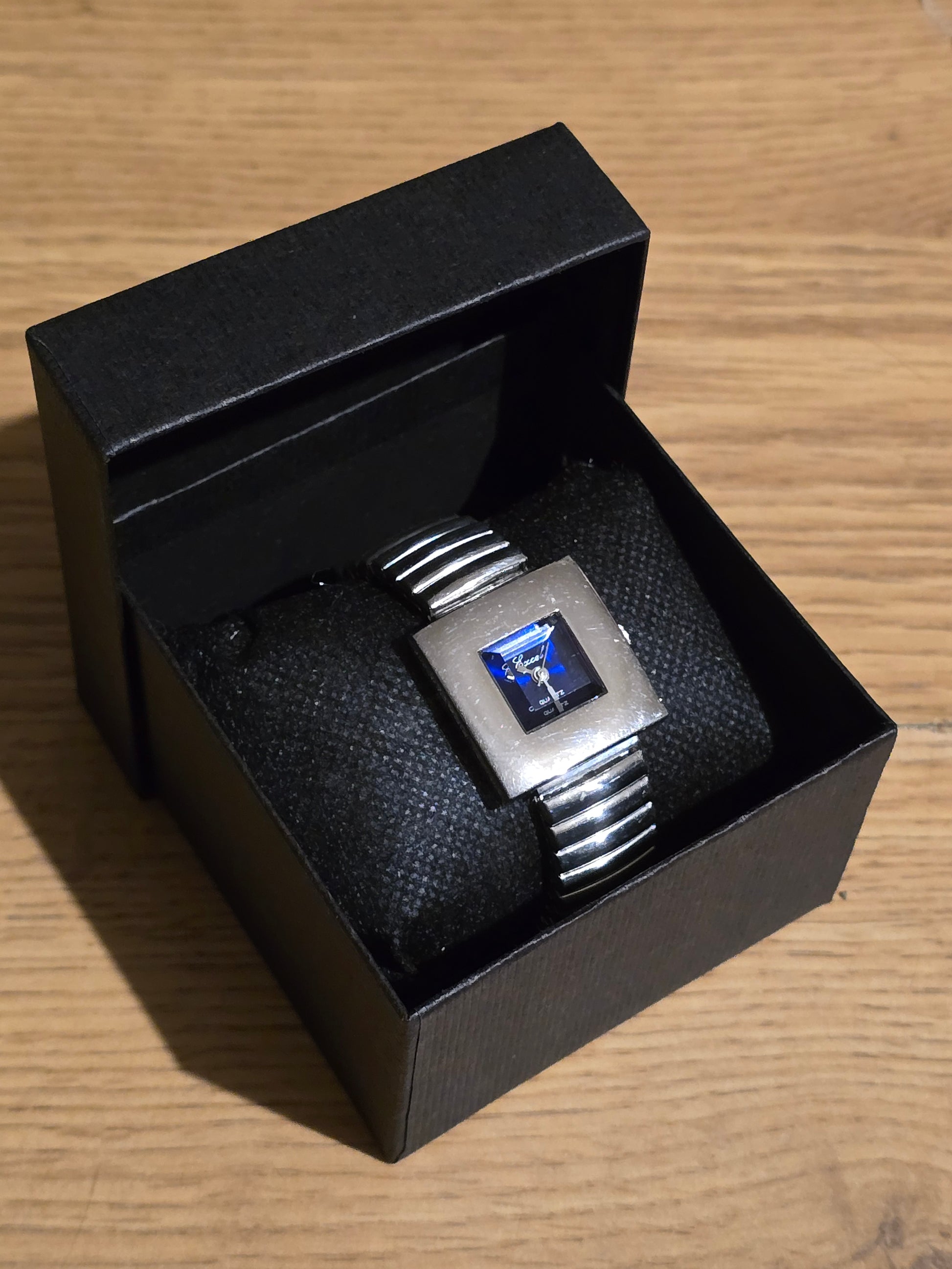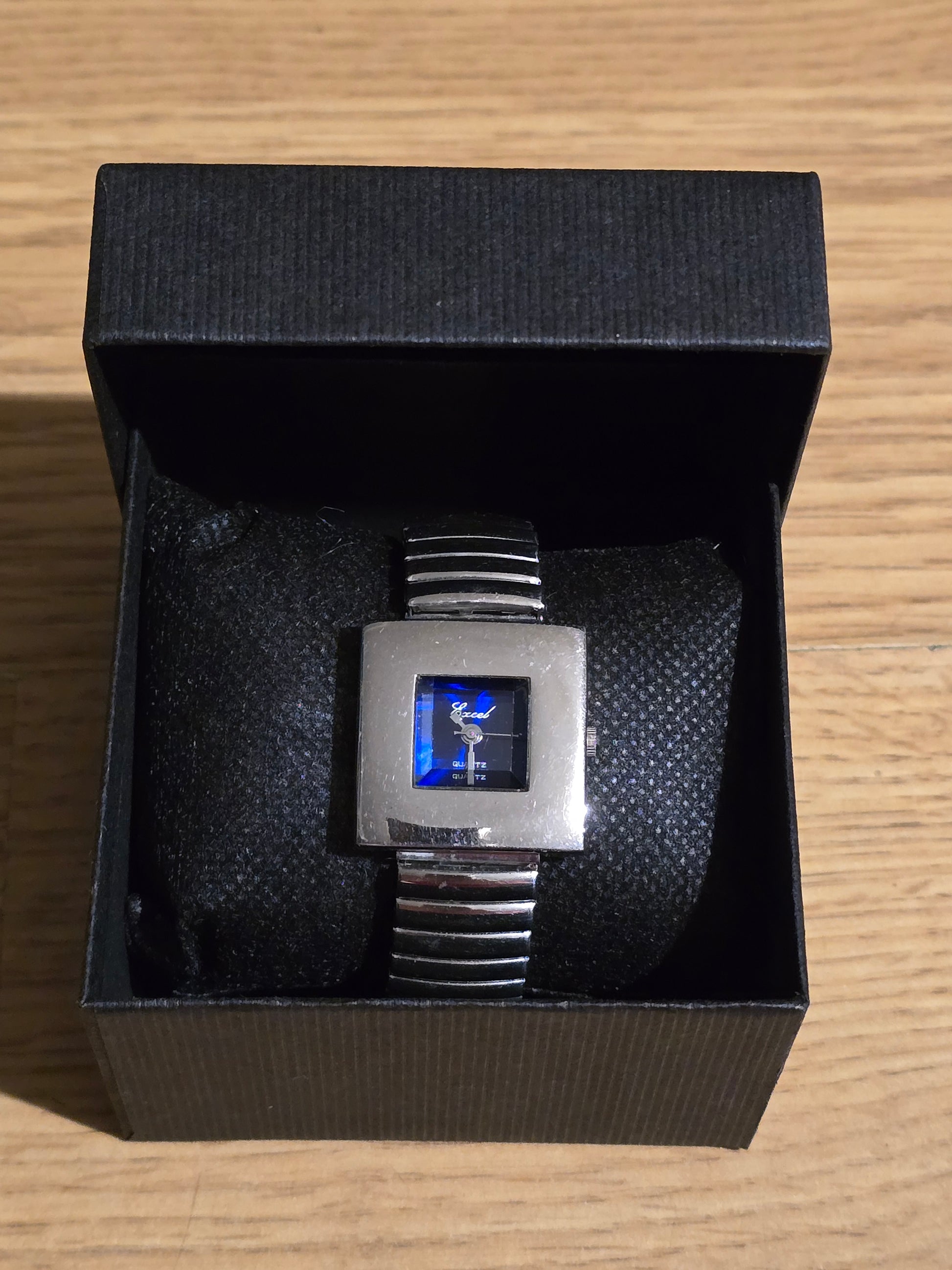 The Excel Ladies Quartz Dress Watch boasts an unusual design, with a reliable Quartz Movement and an elasticated flexi-strap for comfortable wear. A new battery has been fitted for your convenience. Elevate your style with this sleek and functional timepiece!