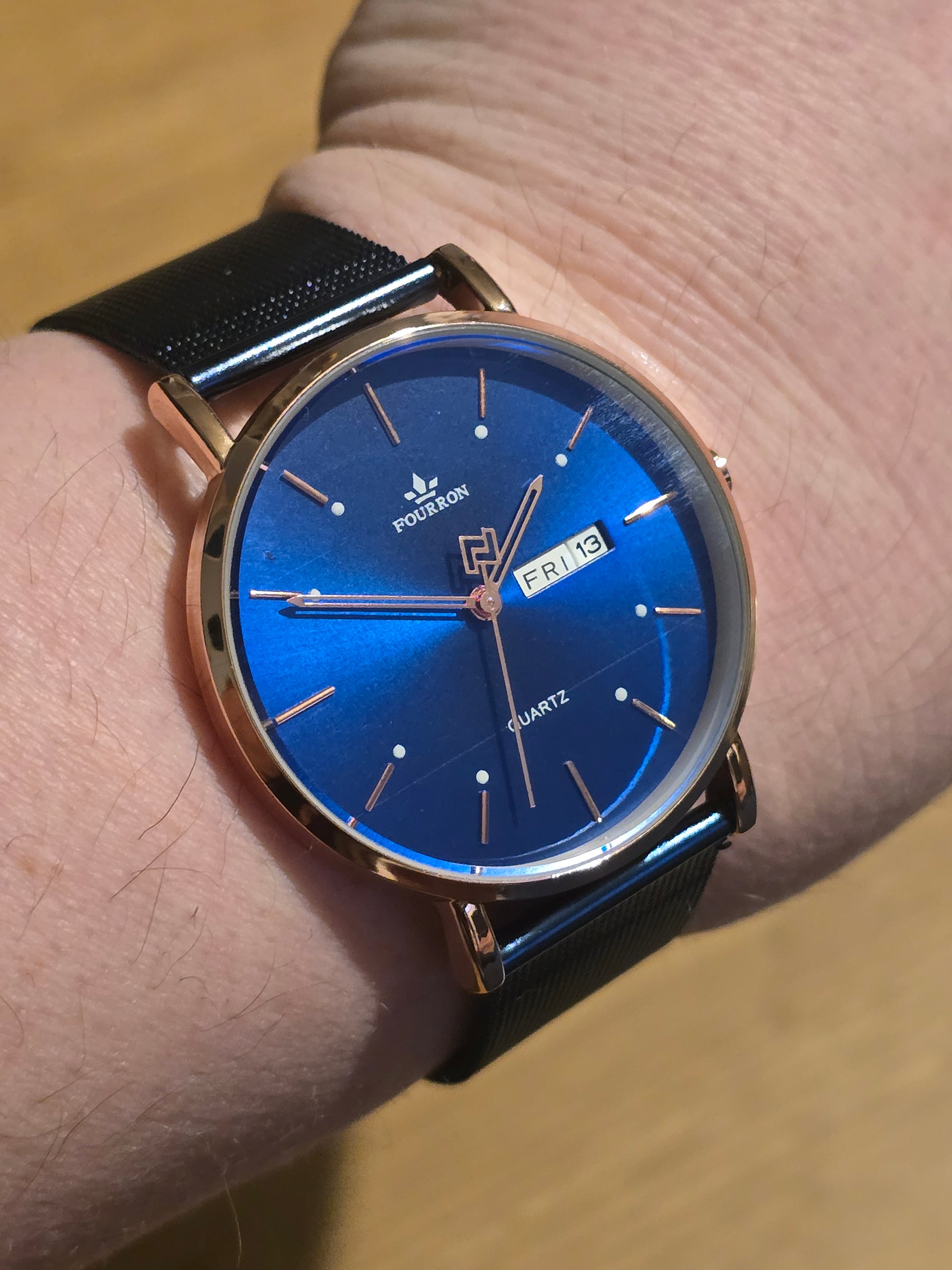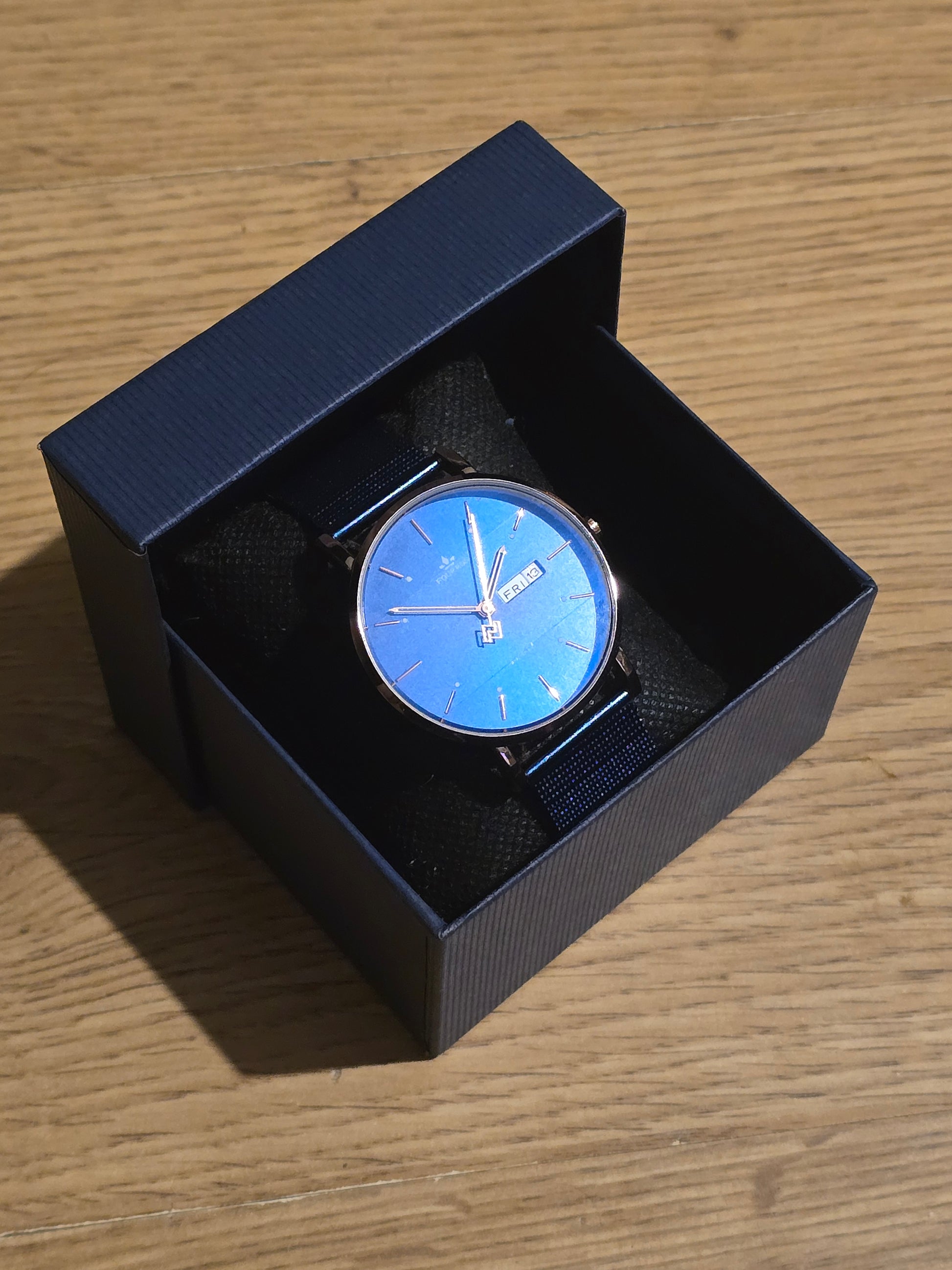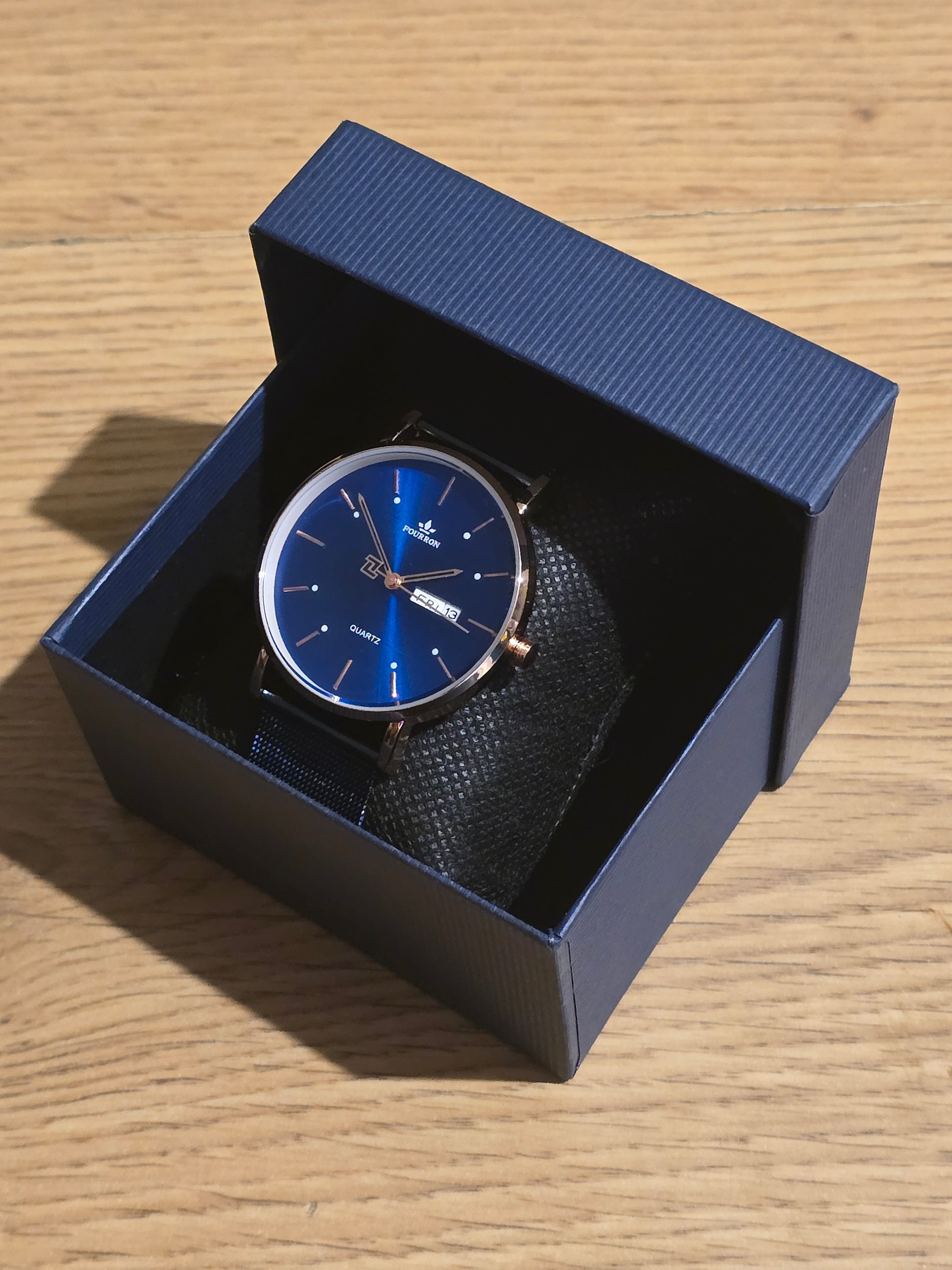 Introducing the Four Ron Quartz Watch, a timeless addition to any wardrobe. This beautifully designed watch features a stunning blue face and matching strap, along with a convenient day and date feature. With its simple yet elegant design, this watch is sure to make a statement.