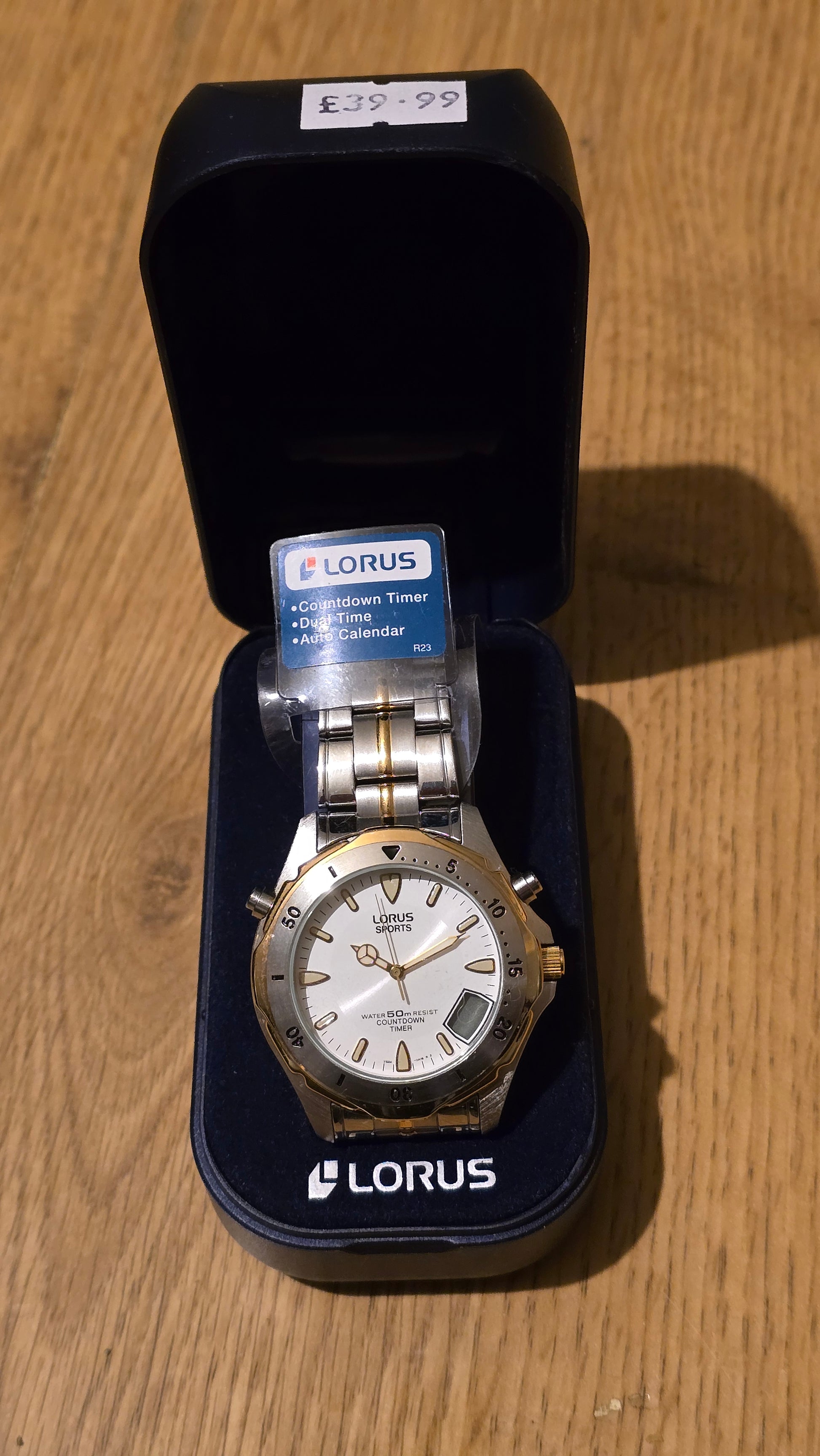 Stay on time and in style with the Lorus Mens Sports Quartz Watch. Its reliable Japanese quartz movement ensures accuracy while its sophisticated design adds a touch of elegance to your sporty look. The durable stainless steel strap makes it perfect for everyday wear. With a countdown timer feature, never miss a deadline again. New Old Stock, so just pop in a new battery and you're ready to go!