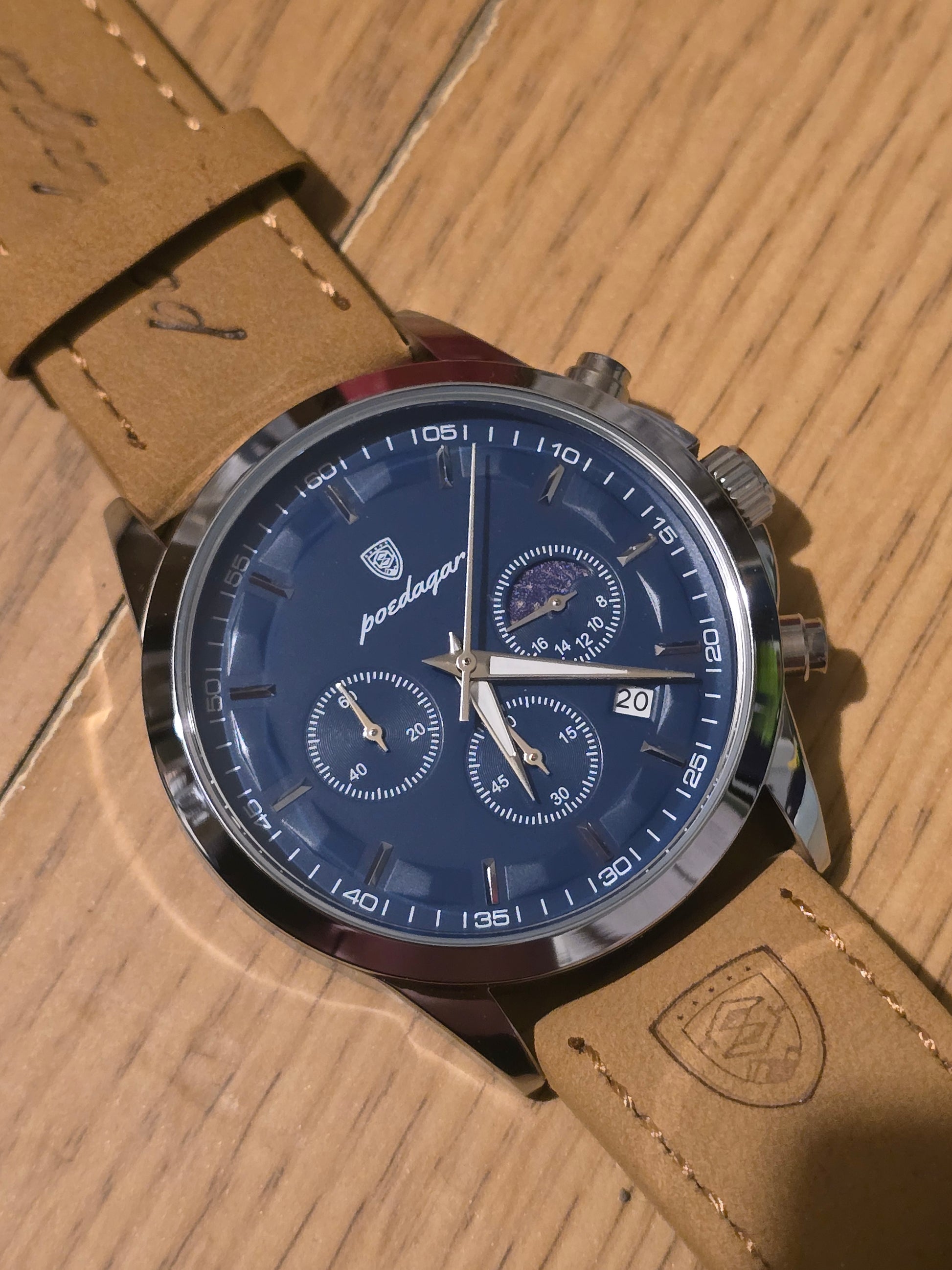 Introducing the Poedagar Mens Quartz Watch. With an elegant and professional design, this watch is perfect for any occasion. The genuine leather strap adds a touch of luxury, while the reliable Quartz Movement ensures accurate timekeeping. Upgrade your style and stay punctual with this must-have accessory.