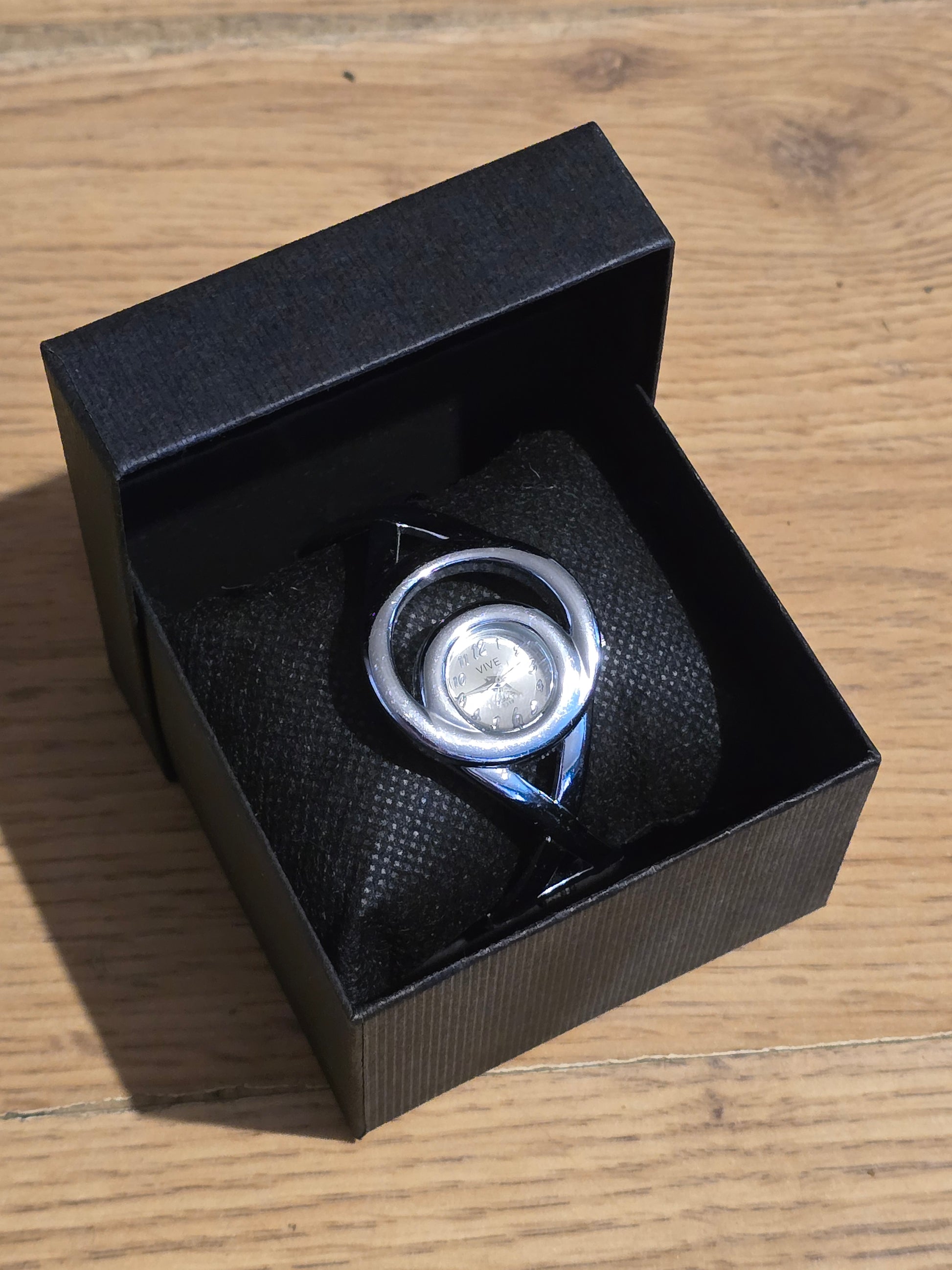 Upgrade your style game with the Vive Ladies Quartz Dress Watch. Its unique design exudes elegance and sophistication, perfect for any occasion. The stainless steel strap and casing add durability and shine, while the reliable Quartz Movement ensures accurate timekeeping. Plus, a new battery has been recently fitted for your convenience.